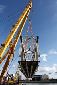 A kivitelezési munkákat komoly technológiai tervezés előzte meg, hiszen a már meglévő hidak közé kellett „beszorítani” az új, 450 tonna körüli szerkezetet. Az úszódarus „tandem” átemelési technikák és az új emelőállvánnyal ellátott és megnövelt kapacitású bárkák stratégiailag fontos szerepet játszottak projekt sikeres kivitelezésében.