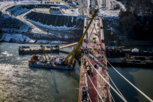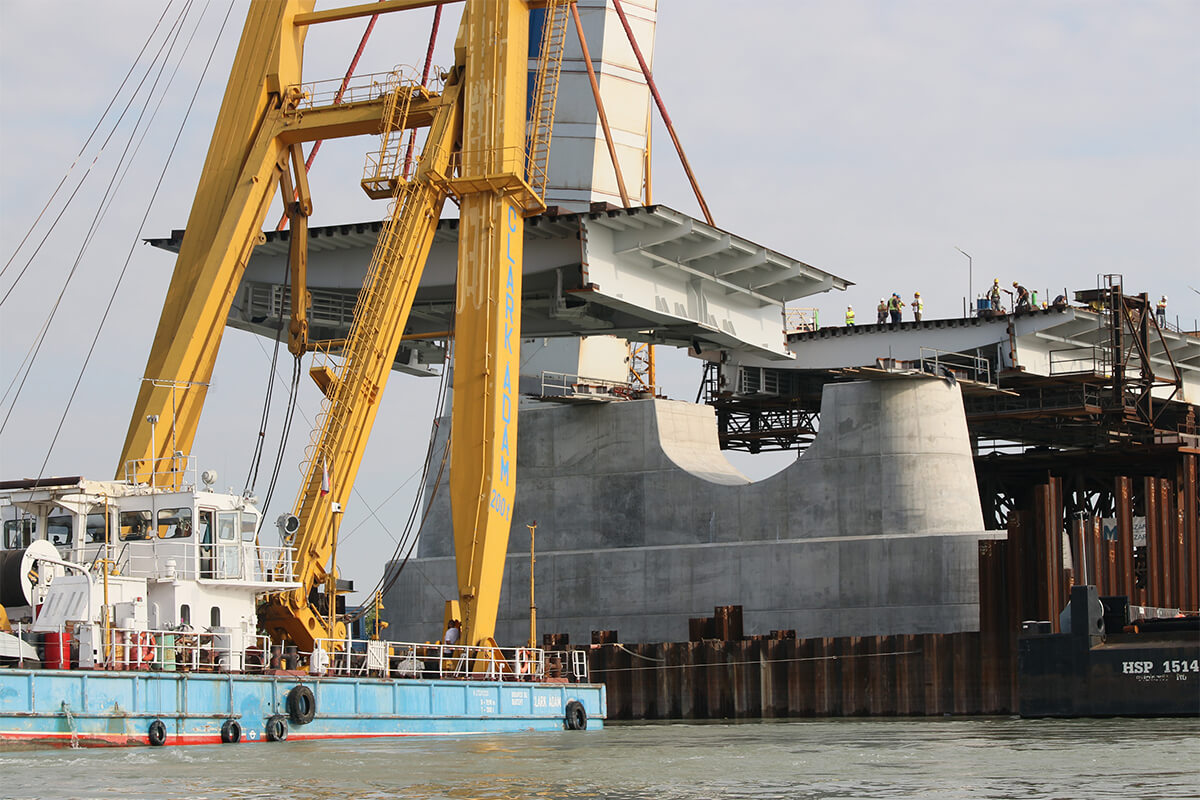 A pilon 48 db elemből áll, teljes magassága 118 m, amelyből az útpálya feletti magasság 94,5 méter. Alsó részének emeléséhez is nélkülözhetetlen volt a nagy teherbírású úszódarunk munkája.