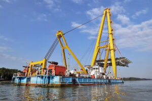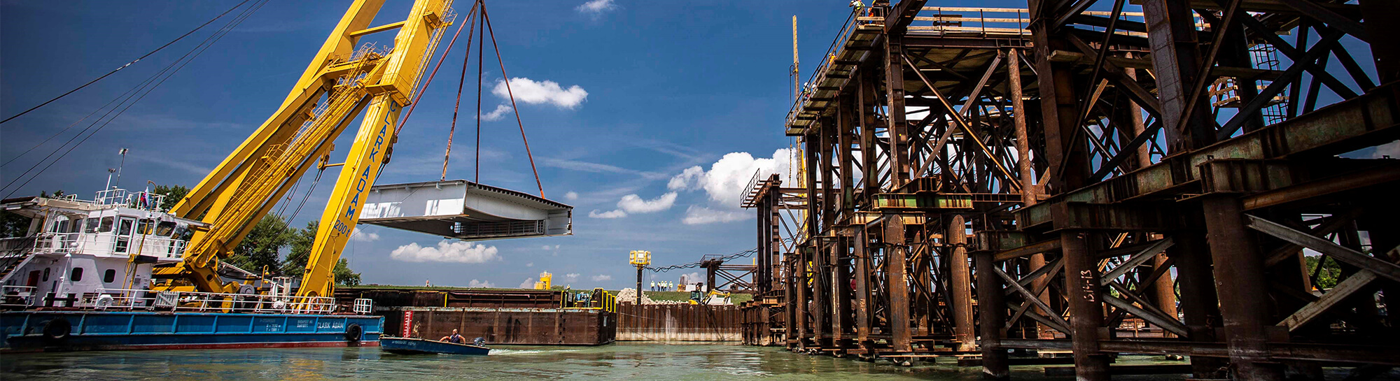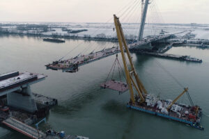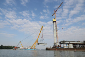 Az acélból készült elemeket (elemenként 80-140 tonna) először a Clark Ádám úszódaruval, majd toronydaruval emeltük a helyükre. A hídpályát 35 elemből szerelték össze, melyeket szintén a Clark Ádám úszódaru segítségével egyesével emeltük a helyükre.