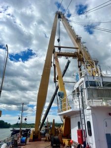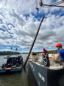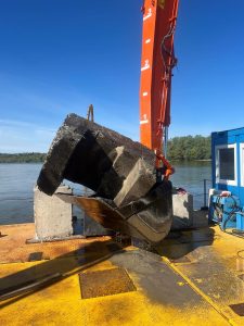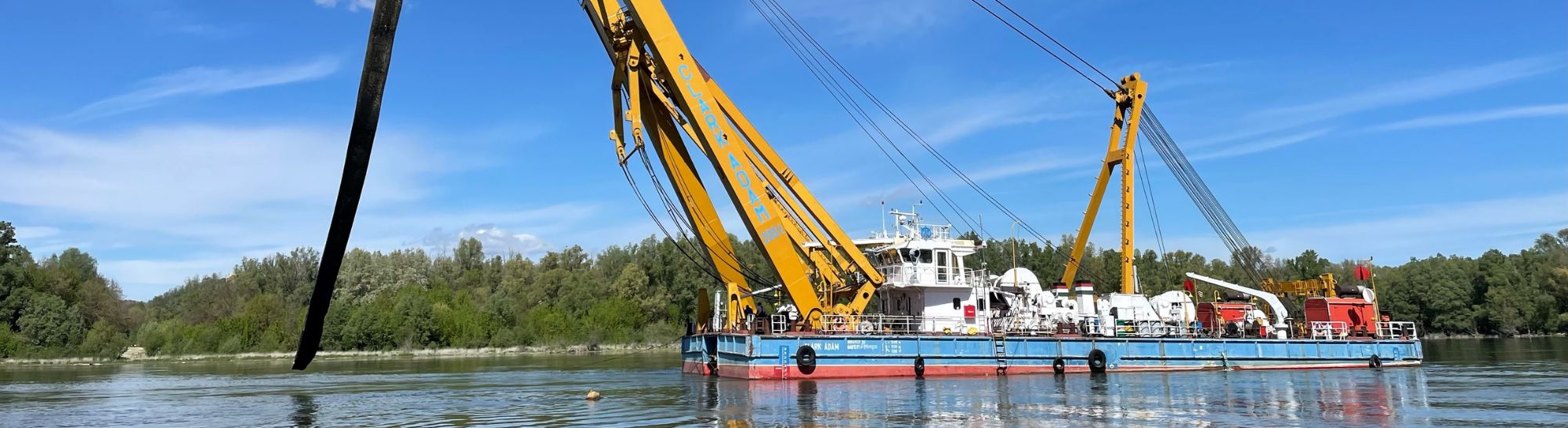 Az első két hétben 140 méteres szakaszt tisztítottunk meg, ezzel előkészítve a terepet a csövek víz alatti vágására és kiemelésére. Március elején a projekt új szakaszba lépett: a Clark Ádám úszódaru megérkezett a helyszínre, és megkezdődött az előzetesen felszabadított, darabokra vágott csőszakaszok kiemelése. A kinyert elemeket bárkákra helyeztük, majd elszállítottuk, a munkafolyamatot pedig április 9-ig folytattuk, gondosan ügyelve minden emelési és szállítási mozzanatra.