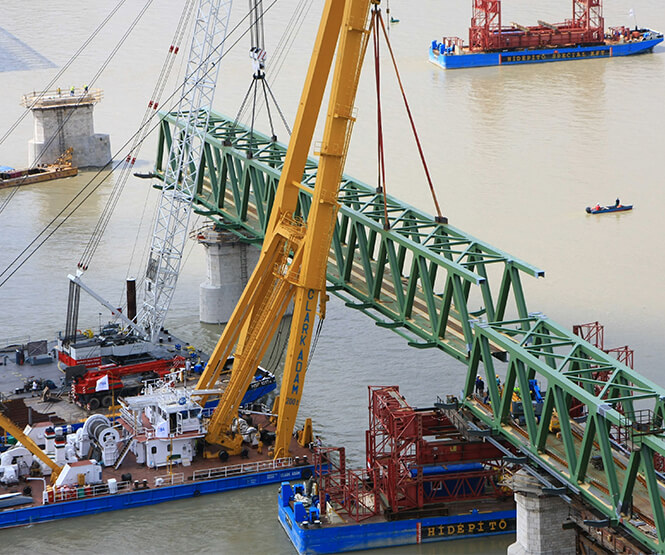 A folyami és állóvízi hidak építése során a helyszínre úsztatjuk, majd úszódarus emeléssel a helyükre illesztjük az előre összeszerelt hidakat, hídelemeket.