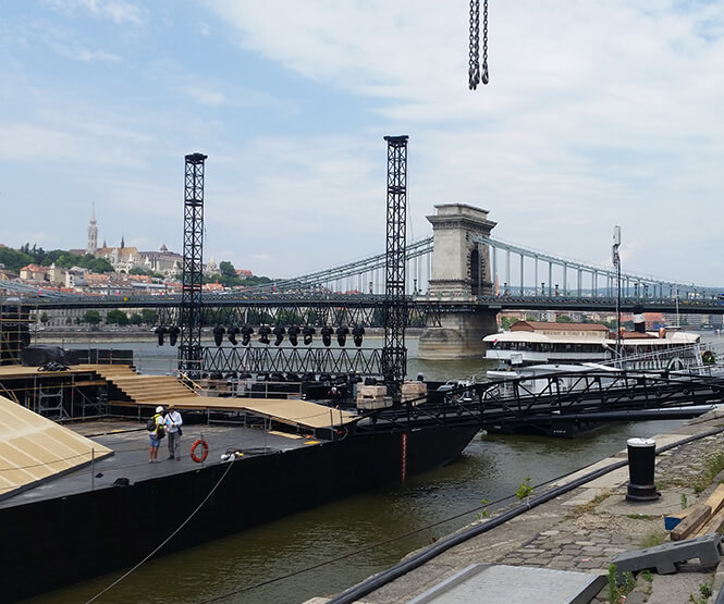 A vízre tervezett nagyobb rendezvényekhez egyedi tervezésű vízi létesítményeket, színpadokat, kikötőket építünk, úszóeszközöket biztosítunk. A rendezvény lebonyolítása során vízi mentőszolgálatot nyújtunk.